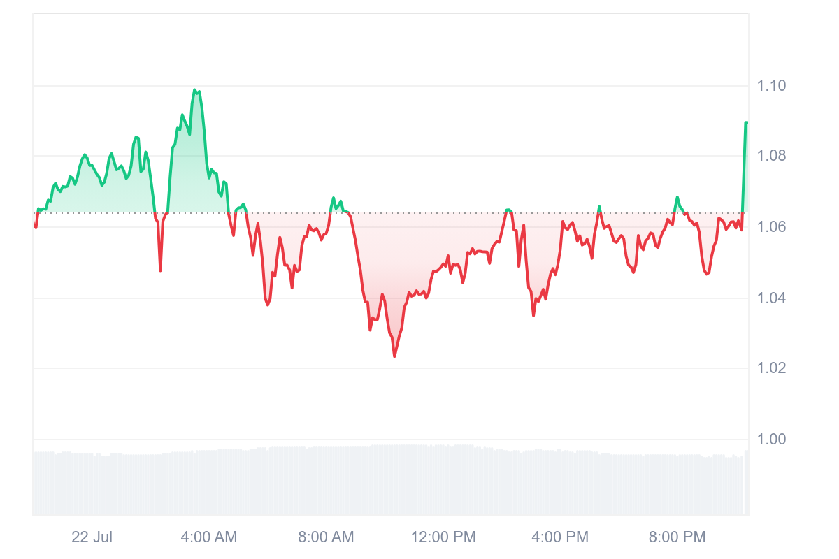 Цена токена выросла до $1,08, прибавив 2,3% за 24 часа. Рыночная капитализация увеличилась до $3,44 млрд, а суточный объём торгов превысил $343 млн. Дата запуска фонда пока не определена.