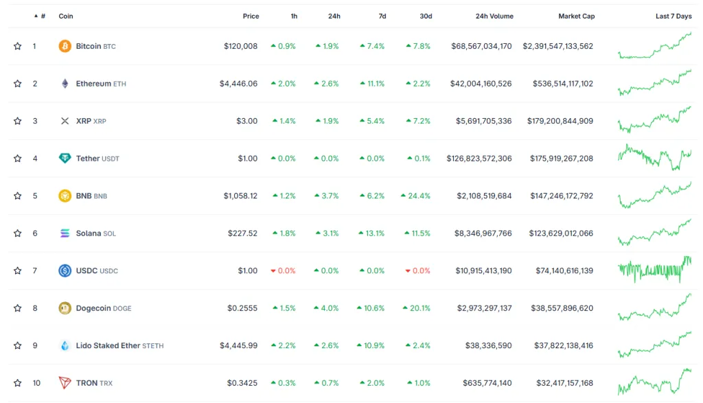 Среди криптовалют из топ-10 по капитализации Solana (+11%), Dogecoin (+9%) и Cardano (+7,4%) тоже продемонстрировали значительный рост.