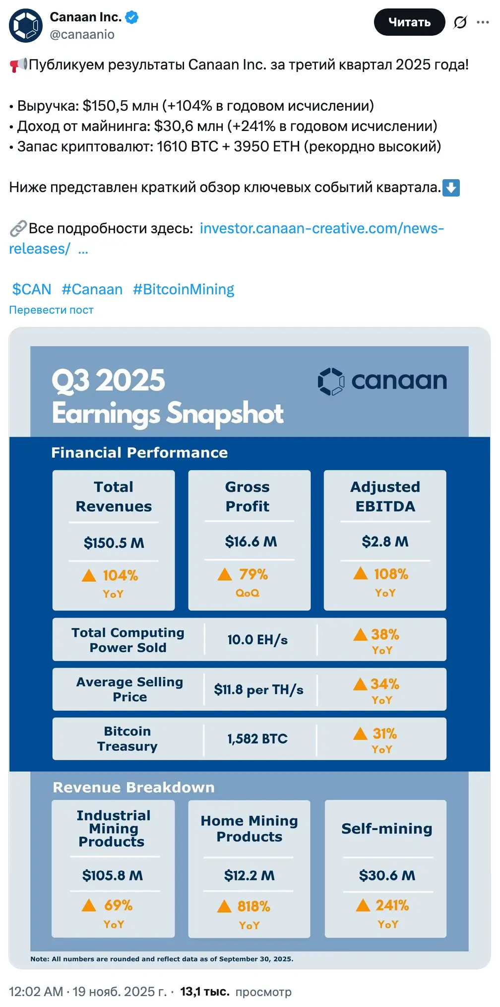 Canaan добыла 267 биткоинов при средней выручке $114 485 за монету и увеличила свои запасы до 1610 биткоинов к концу октября.