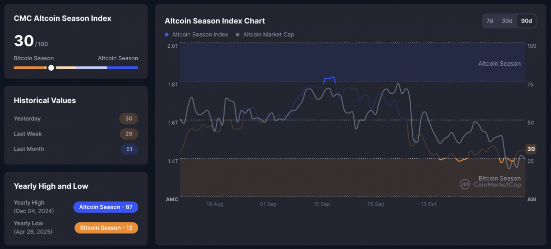 Несмотря на уверения Хайленда о том, что рынок альткоинов может вскоре набрать обороты, индекс сезона альткоинов CoinMarketCap в настоящее время находится на отметке 30 из 100, что указывает на «сезон биткоина». Последний раз индикатор показывал «сезон альткоинов» 8 октября, всего через несколько дней после того, как биткоин достиг нового исторического максимума $125 100, когда трейдеры ожидали ротацию капитала.