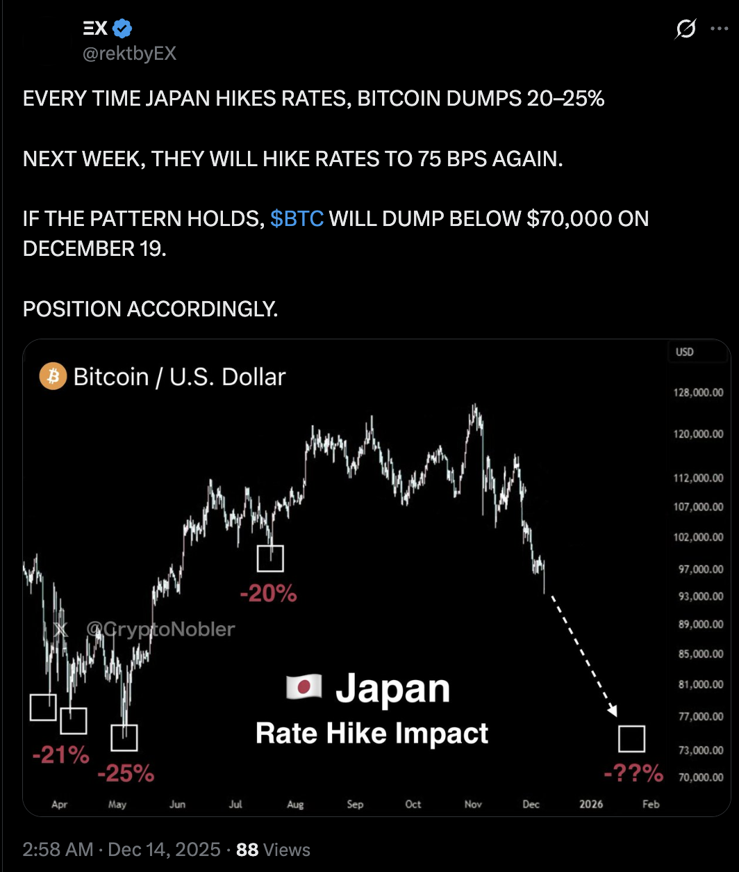 Если Банк Японии (BoJ) повысит процентные ставки 19 декабря, то первая криптовалюта может обвалиться до уровней около $70 000.