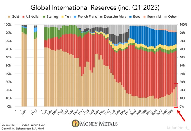 «Мы завершаем этот обзор графиком: резкий рост золота как % мировых резервов, в то время как % доллара США падает», — заявило издание The Kobeissi Letter.