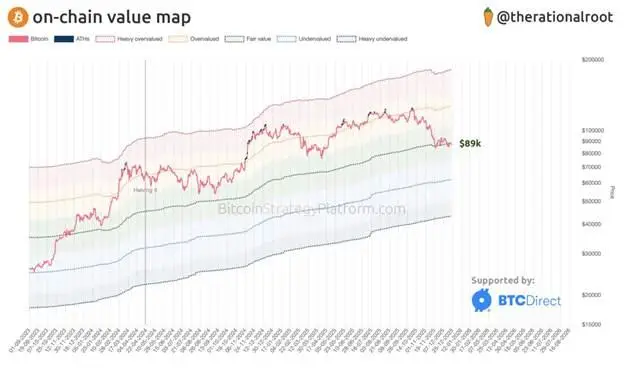 Модель показывает, что биткоин сейчас и не переоценен, и не недооценен. Это отличает сложившуюся ситуацию от ситуации октября 2025 года, когда цена первой криптовалюты в моменте превысила уровень переоценки на историческом максимуме, объявил Root.