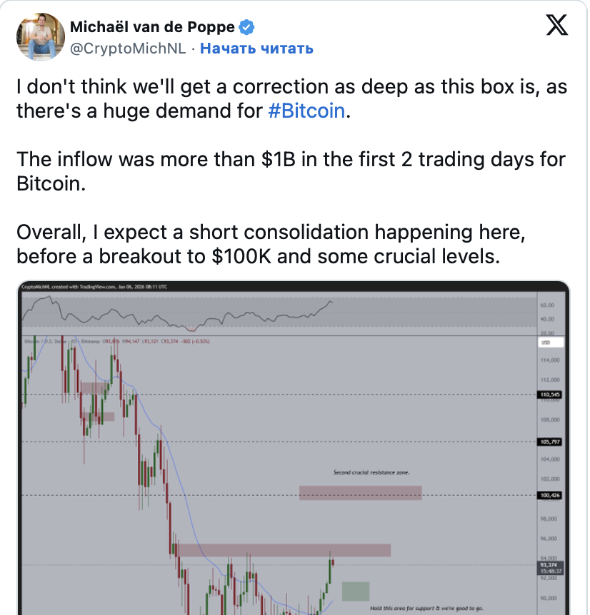 По мнению экспертов, если активу не удастся преодолеть этот рубеж в ближайшее время, глобальный нисходящий тренд останется в силе. Аналитик Тед Пиллоуз отметил, что сейчас биткоин пытается закрепиться выше уровня открытия 2025 года. Успешное закрытие нескольких дневных свечей в этой зоне откроет путь к тестированию психологической отметки в $100 000. В противном случае возможна коррекция к уровням поддержки в диапазоне $90 000–$91 000.