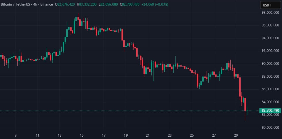 В ночь на 30 января 2026 года биткоин обвалился ниже $82 000, в моменте торгуясь вблизи $81 000. На момент написания цена актива составляет около $82 700: