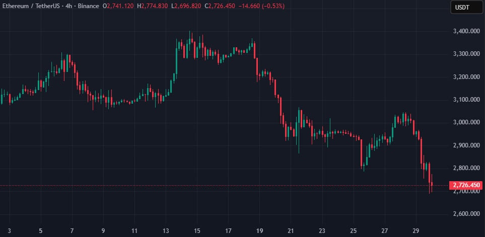 Ethereum также подешевел и опустился ниже $2700. Сейчас он торгуется вблизи $2730: