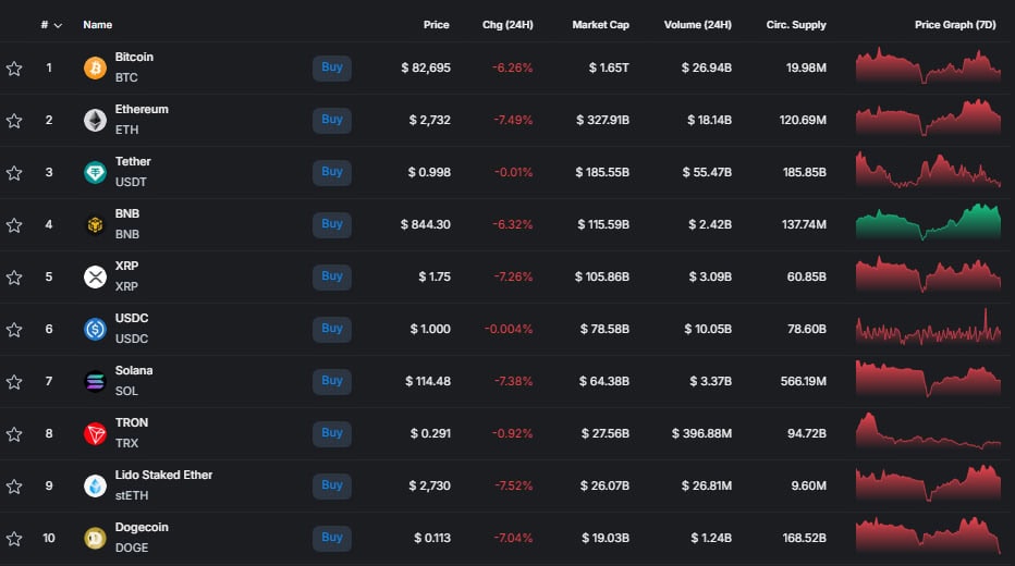 Просадка затронула и остальные активы. В частности, из топ-10 криптовалют по рыночной капитализации Ethereum снизился сильнее всего — примерно на 7,5%.