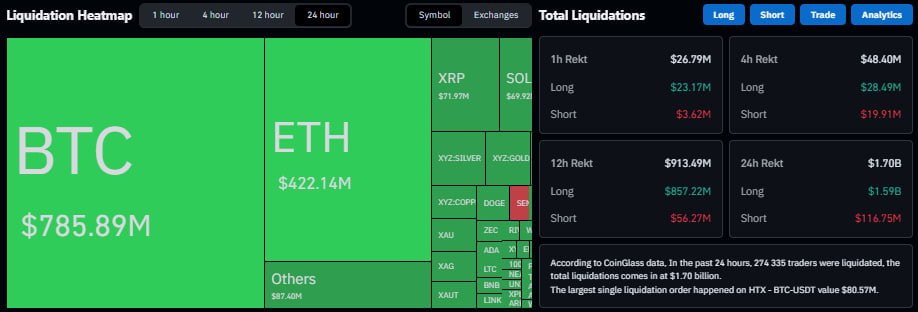 По данным CoinGlass, на фоне коррекции на рынке объем ликвидаций превысил $1,7 млрд. При этом более $1,59 млрд пришлось на лонг-позиции.