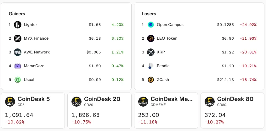 Почти все токены, включенные в индекс CoinDesk (включая крупные токены и мемкоины), за последние 24 часа потеряли более 10% стоимости.