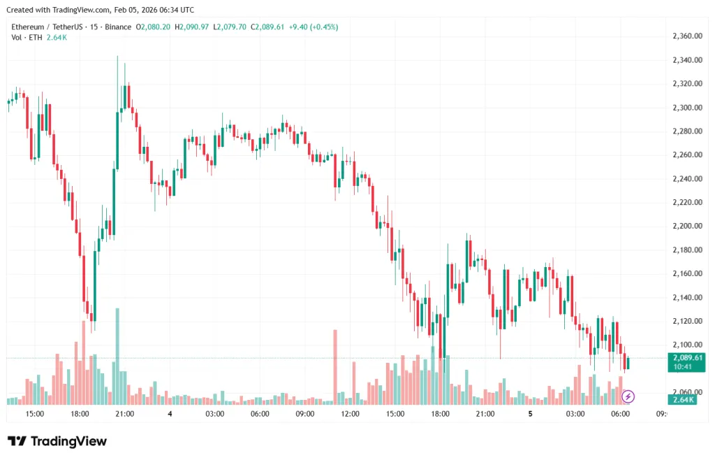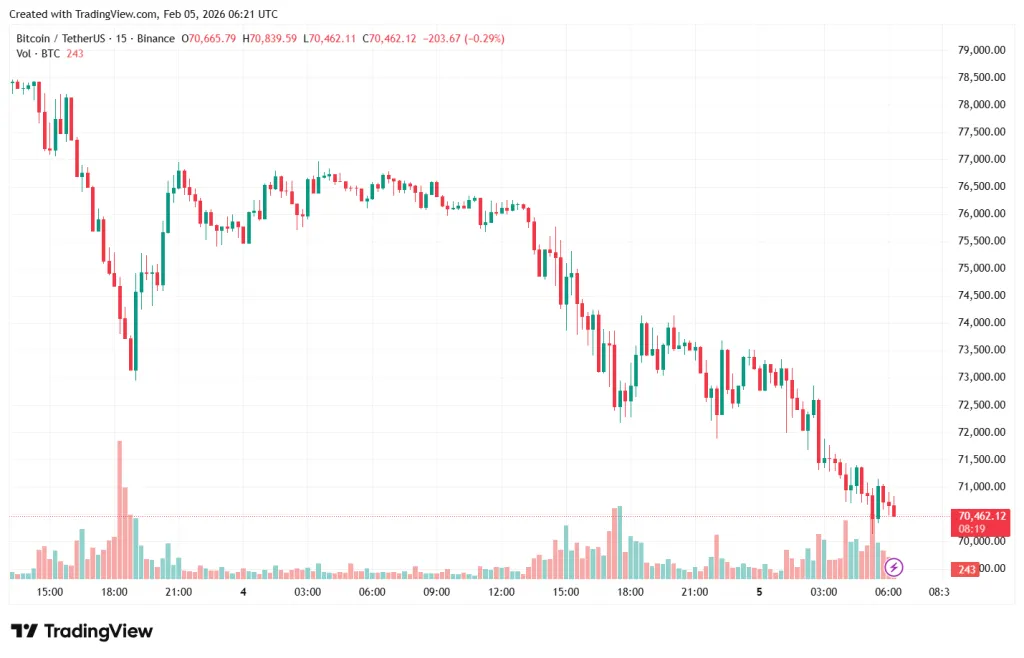 5 февраля котировки первой криптовалюты опустились до $70 119 — минимум с октября 2024 года. Ethereum последовал за флагманом, просев до $2079.