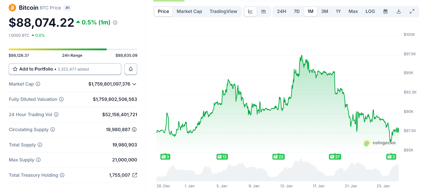 Динамика биткоина в январе 2026 года. Источник: CoinGecko