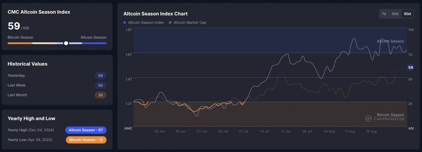 По его мнению, это может сигнализировать о приближении «мега-альтсезона», подобного мощным ралли 2017 и 2021 годов. 28 августа индекс сезона альткоинов CoinMarketCap сменил статус с «сезона биткоина» на «сезон альткоинов», достигнув 60 баллов из 100.