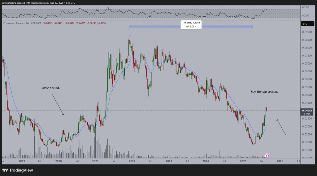 Особенно оптимистично настроен криптотрейдер и аналитик Михаэль ван де Поппе (Michaël van de Poppe), который заявил в соцсети X: «Все предельно ясно. Наступил сезон покупок на падении для Ethereum, поскольку бычий тренд только начался».