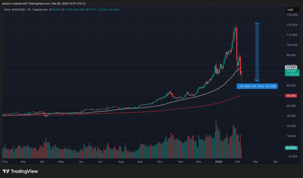Рынок драгоценных металлов пережил исторический обвал. Серебро упало на 20% за день 5 февраля, опустившись ниже $71 за унцию. От пиковых значений конца января ($120-130 за унцию) падение составило около 36%. Крах серебра усилил панику на финансовых рынках, поскольку инвесторы массово выходили из рисковых активов.