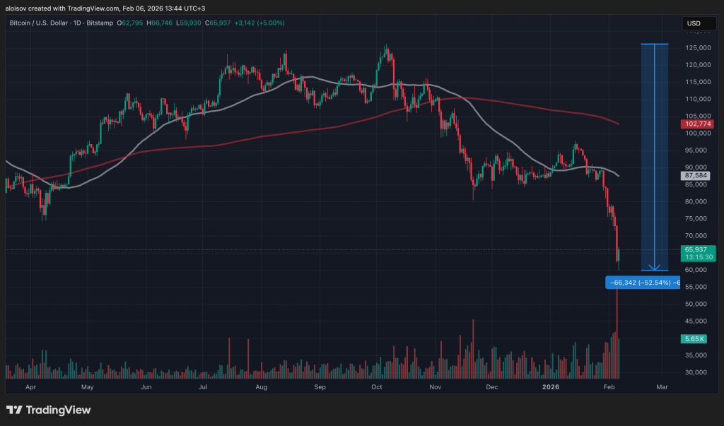 Биткоин зафиксировал первое в истории дневное падение более чем на $10 000, достигнув отметки $59 930 на бирже Bitstamp в пятницу, 6 февраля. Коррекция составила 52,5% от исторического максимума, установленного 6 октября. В течение 5 февраля курс главной криптовалюты снизился на 14%, а за три недели биткоин потерял $30 000.