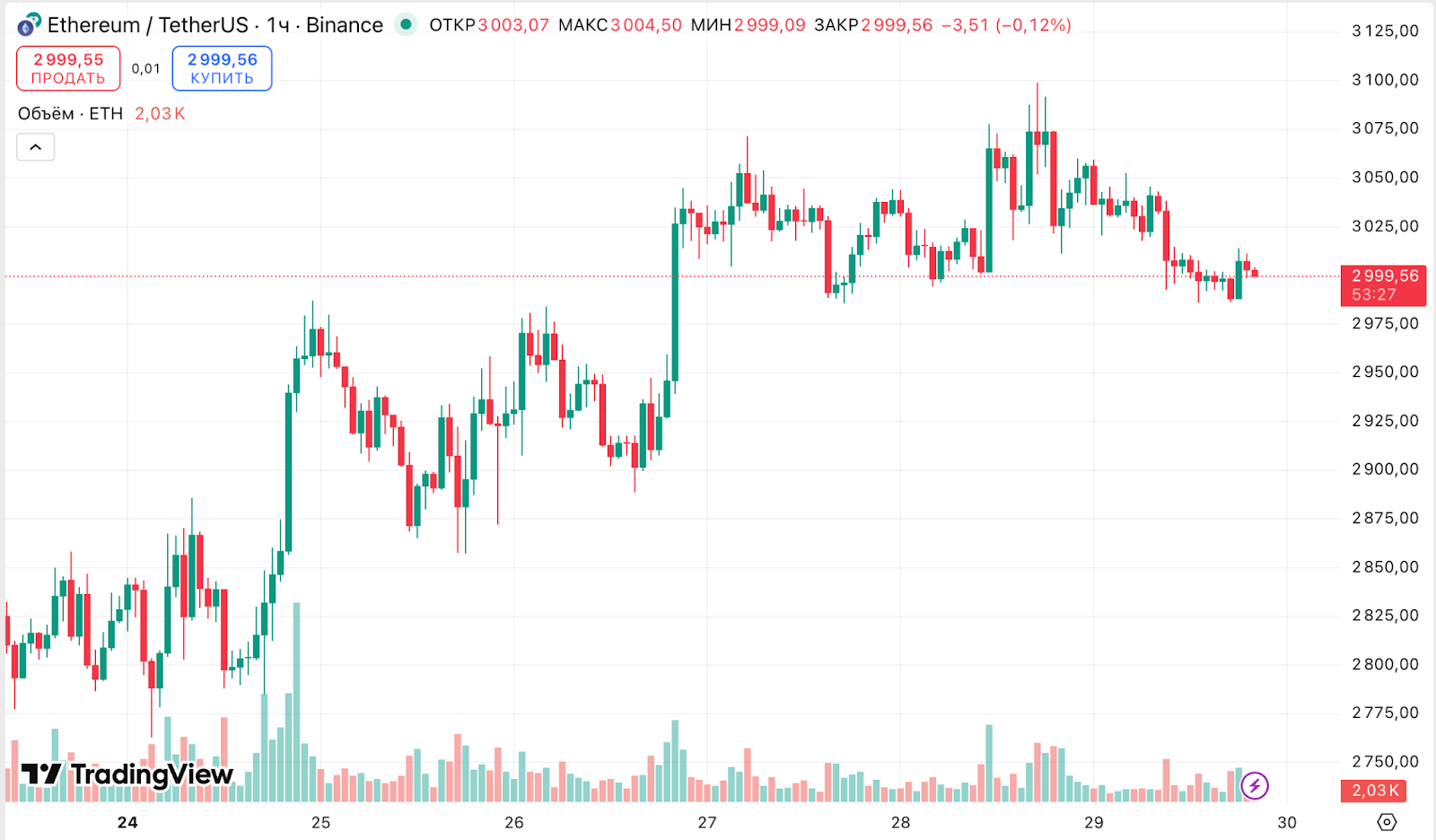 Ethereum (ETH) прибавил 10% за аналогичный период. На момент написания монета торгуется около $3000.