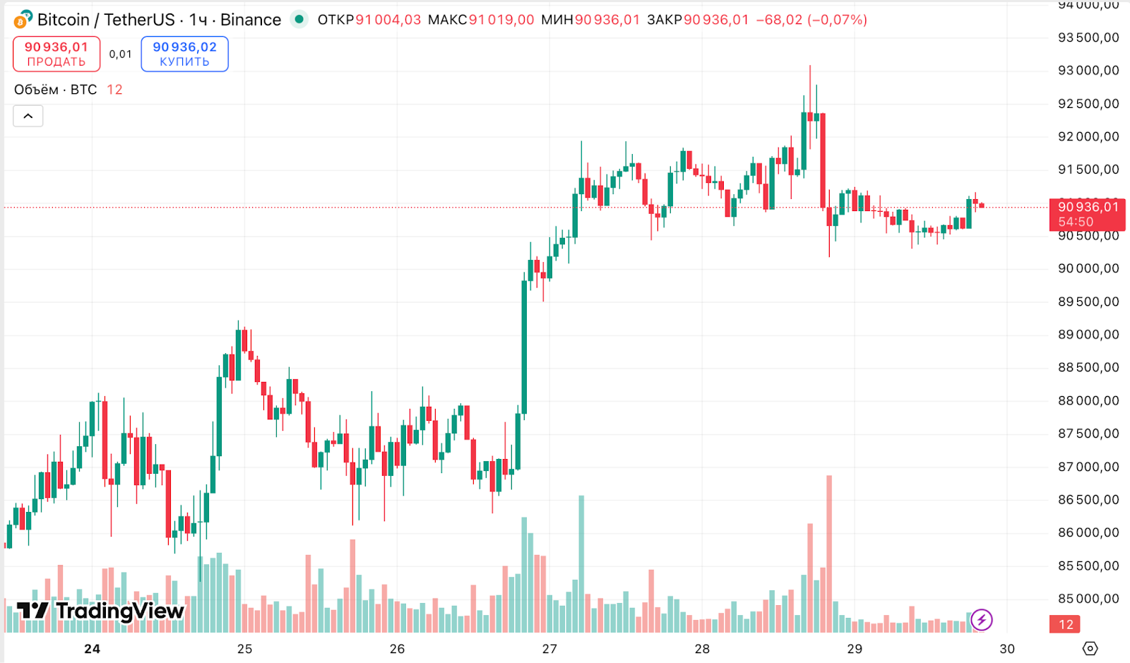 За последнюю неделю цена биткоина (BTC) выросла на 8,2% — цифровое золото закрепилось над отметкой $90 000.