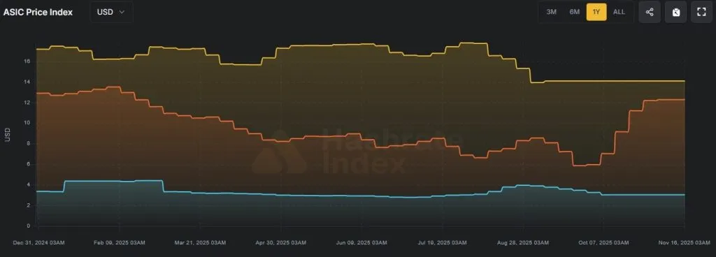 С октября до ~$12 за TH/s выросли цены на майнеры предыдущих линеек с диапазоном 19-25 J/TH. Устройства с более низкой энергоэффективностью доступны примерно по $3 за TH/s.