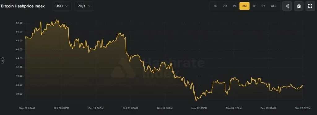 С середины ноября хешпрайс балансирует на отметках ниже $40 за PH/s в сутки. Последнее значение примерно соответствует уровню безубыточной работы биткоин-майнеров.