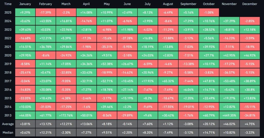 По данным CoinGlass, исторически биткоин в октябре демонстрирует средний рост на примерно 20%. Месяц по показателю уступает только ноябрю с 46%, получив в сообществе наименование Uptober. Название обыгрывает слово up — вверх.