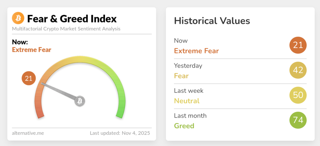 Криптовалютный индекс страха и жадности опустился до 21 пункта — зона «экстремального страха». Днем ранее показатель находился на отметке 42, сигнализирующей об умеренных опасениях .