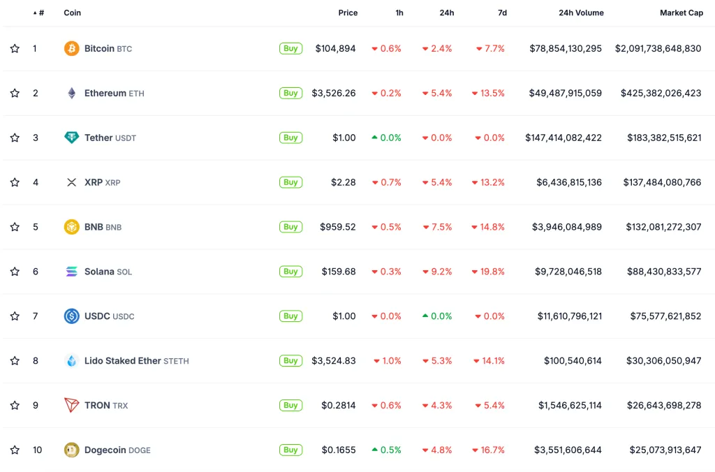 Стоимость рынка снизилась на 3% — до $3,5 трлн. Все крупнейшие по капитализации криптовалюты скорректировались.
