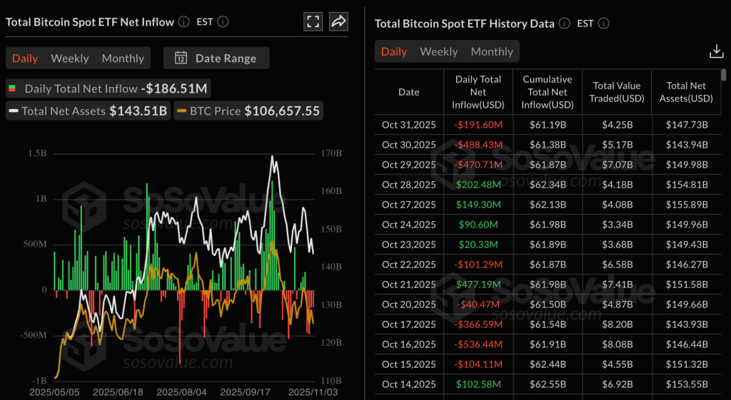 Дополнительное давление на цену первой криптовалюты могут оказывать продолжающиеся третий день оттоки из спотовых биржевых фондов на базе биткоина. За последнюю торговую сессию инструменты потеряли $191 млн, а с 29 октября — более $1,1 млрд.