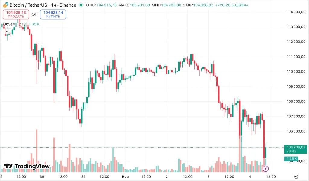 За последние сутки первая криптовалюта подешевела на 2,2%, достигнув многомесячного минимума на уровне ~$104 800.
