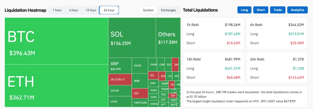 На фоне падения сумма ликвидаций превысила $1,3 млрд за прошедшие 24 часа. На лонги пришлось $1,2 млрд, а на шорты — $143,6 млн.