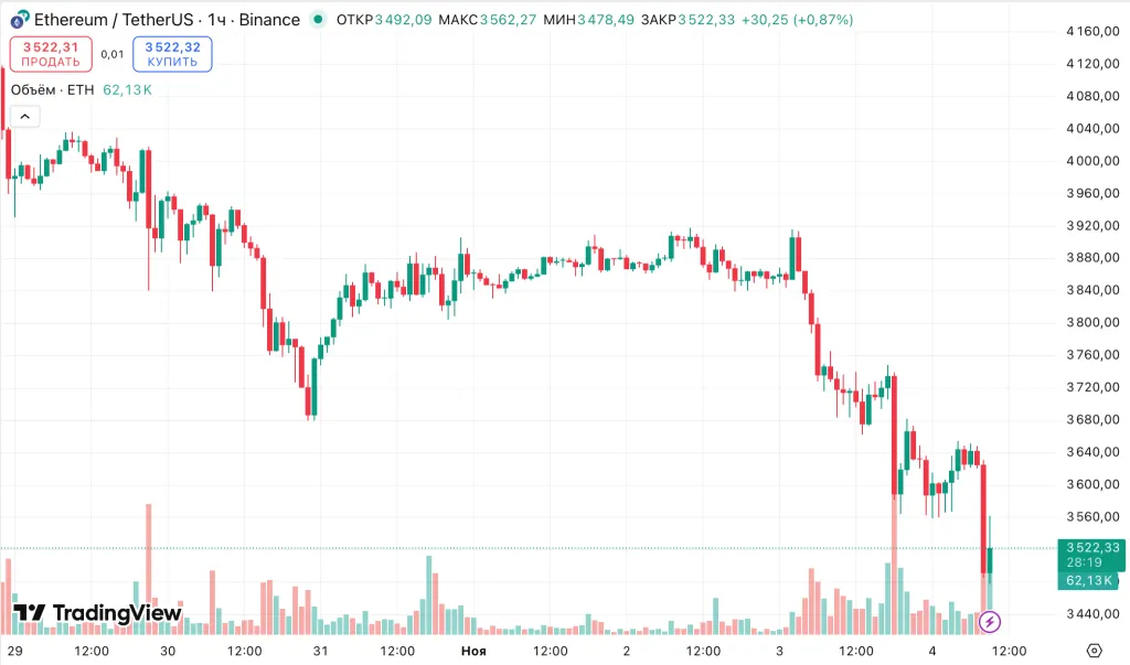 Курс Ethereum за тот же период опустился на 5,4%. На момент написания ведущий альткоин торгуется у отметки $3500.