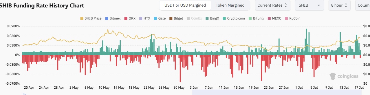 Росту цен на сиба-ину в последние несколько дней способствуют прочные фундаментальные факторы, включая активность на блокчейне. Например, ставка финансирования сиба-ину большую часть июля оставалась положительной после продолжительного снижения с начала года. Исторически устойчиво положительная ставка финансирования ассоциируется с бычьими настроениями, и наоборот.