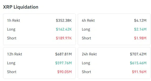 По данным CoinGlass, за последние 24 часа ликвидировано около $707 млн по XRP.
