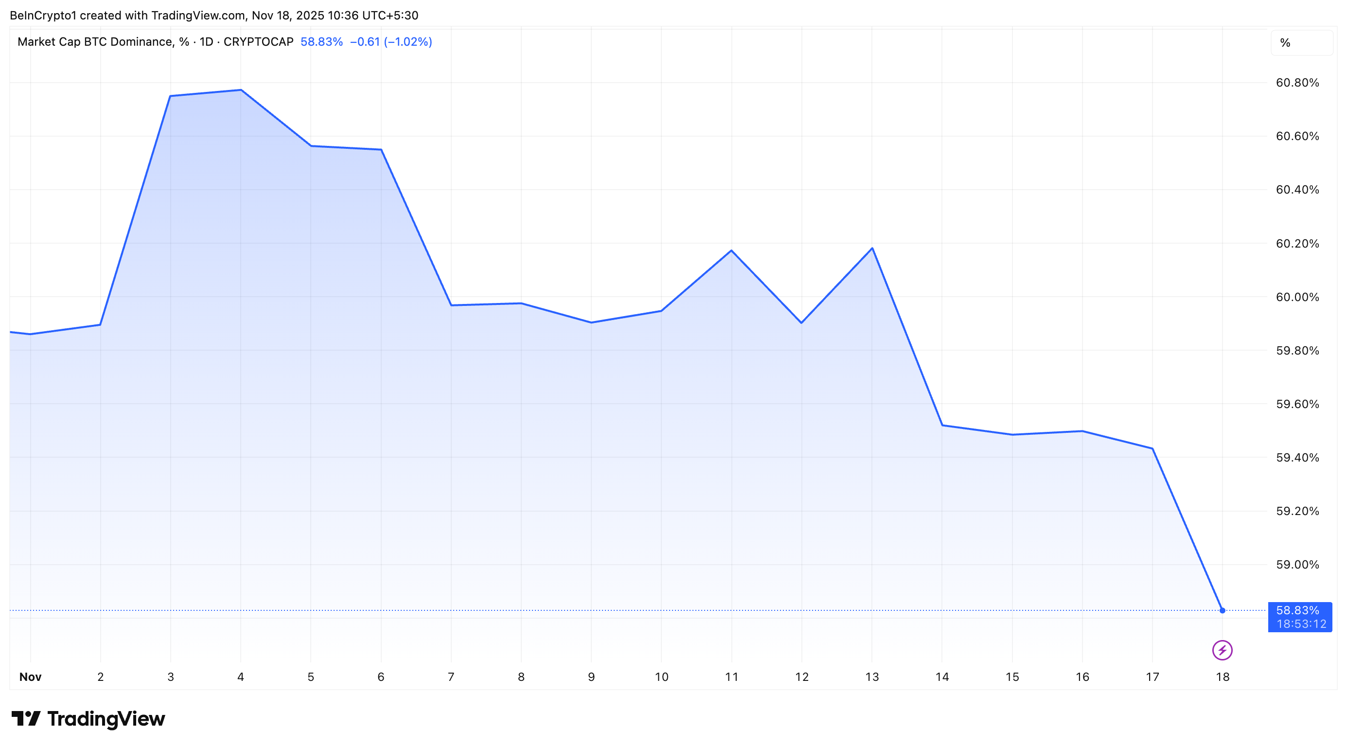Согласно биржевым данным, в ноябре значение BTC.D опустилось до 58.8%. Ранее показатель находился на уровне 61.4%.