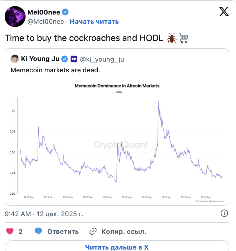 Несмотря на доминирующий негативный фон, ряд участников рынка сохраняет уверенность в потенциальном восстановлении мем-коинов. Они указывают на снижение доминирования сектора как на ключевой индикатор возможного формирования «дна» рынка.