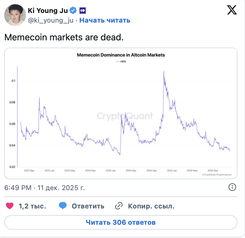 Генеральный директор аналитической платформы CryptoQuant, Ки Ён Чжу, выступил с заявлением о «смерти» рынка мем-коинов, основываясь на последних ончейн-данных. Эти данные демонстрируют, что доминирование мем-коинов в общей капитализации альткоинов опустилось до многомесячных минимумов.