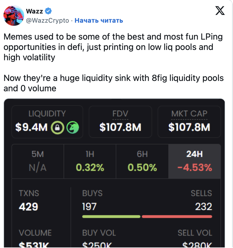«Вы можете поблагодарить Pumpfun и Алона за это… Запуск мем-коинов не должен был стоить менее $1 при нулевой защите от мошенничества. Мы полностью утратили ощущение общности и HODL из-за того, что нас столько раз обманывали. Ни у кого нет веры, все просто извлекают», — опубликовал DeFiApe.