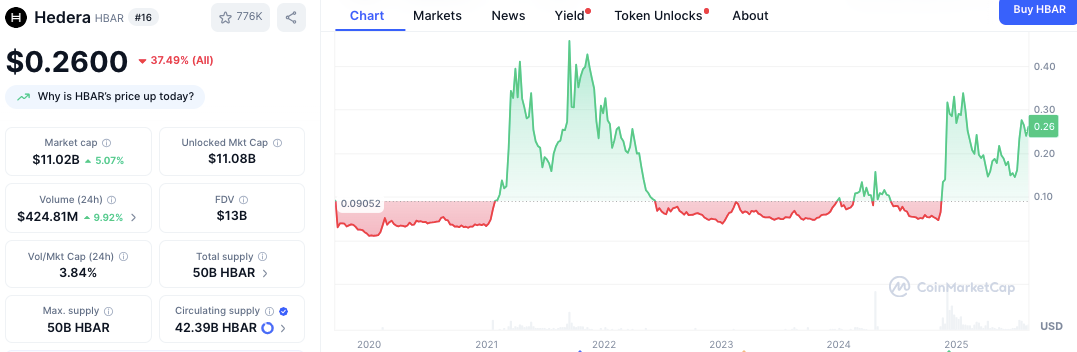 С ранней торговой цены $0,09052 HBAR выросла почти до $0,40 в 2021 году, прежде чем опуститься ниже $0,10 в начале 2023 года. Прорыв в конце 2024 года поднял цены выше $0,30, за которым последовала волатильность.