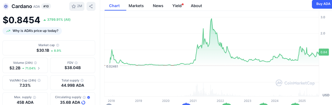 Рынок немедленно и позитивно отреагировал на эти заявления. Cardano (ADA) вырос на 8,9% за последние 24 часа до $0,8454, а суточный объём торгов вырос более чем на 71% до $2,2 млрд.