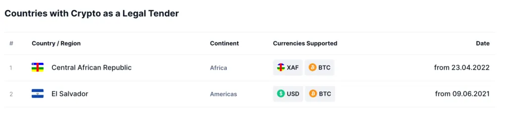 По состоянию на 2025 год только две страны законодательно разрешили гражданам расплачиваться биткоином: Сальвадор и Южно-Африканская Республика (ЮАР), согласно CoinMarketCap.
