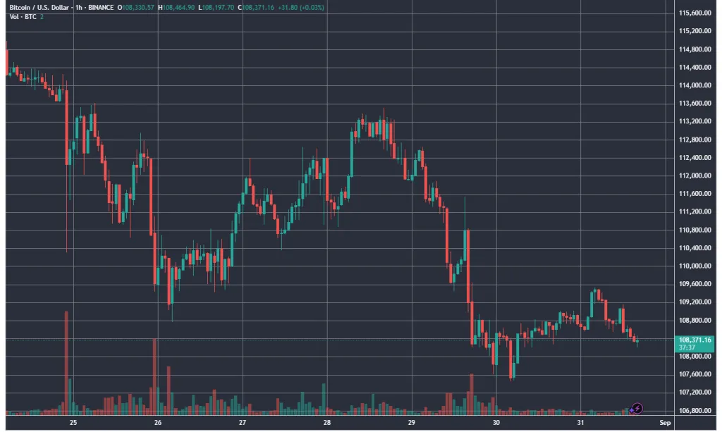 Попытка восстановить прежние уровни оказалась непродолжительной, и в субботу, 30 августа, актив пробил вниз уровень $108 000. На момент написания биткоин торгуется в районе $108 300. К концу августа первая криптовалюта растеряла результаты летнего буллрана и вернулась к отметкам начала июля.