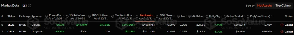 Большая часть поступлений и AUM сосредоточил BSOL — $197 млн и $400 млн соответственно. Среднесуточный торговый оборот — примерно $60 млн.
