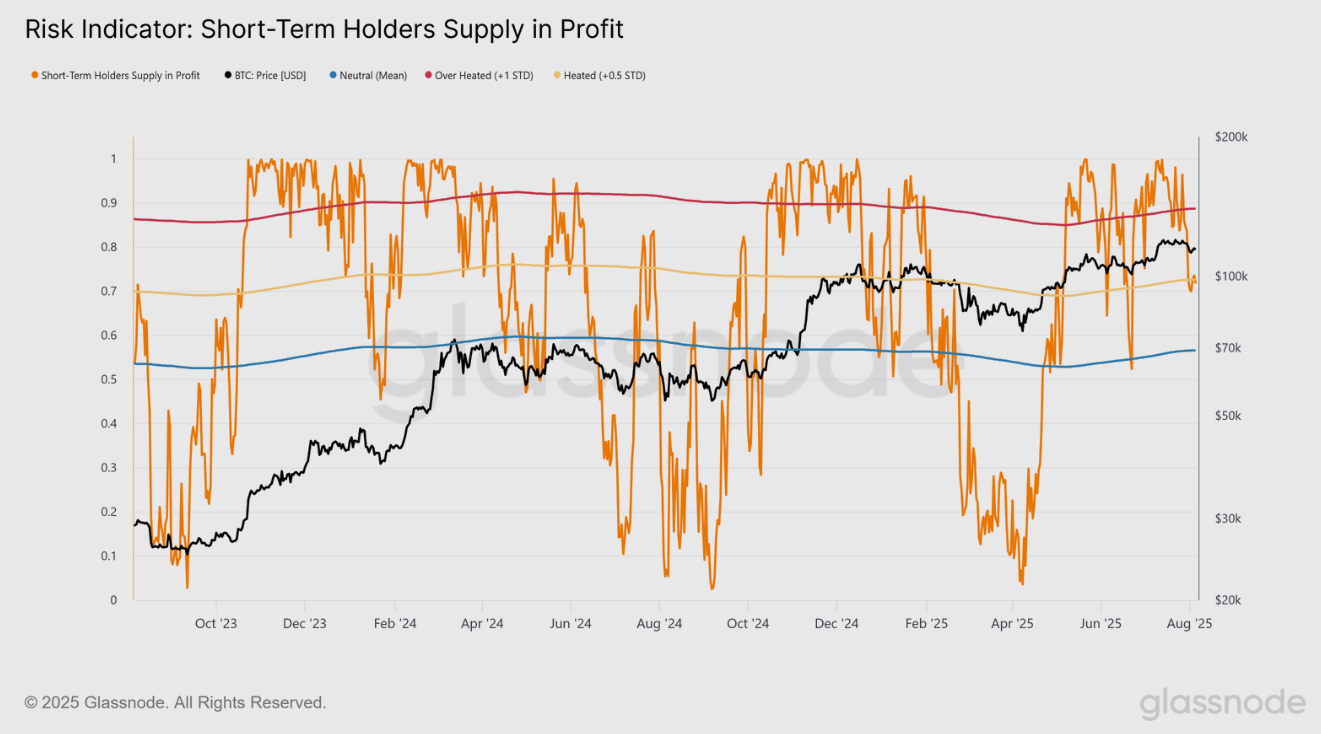 Данные по краткосрочным держателям (STH) указывают на сбалансированную ситуацию. Доля STH в прибыли снизилась со 100% до 70% — типично для коррекций в рамках бычьей фазы рынка.