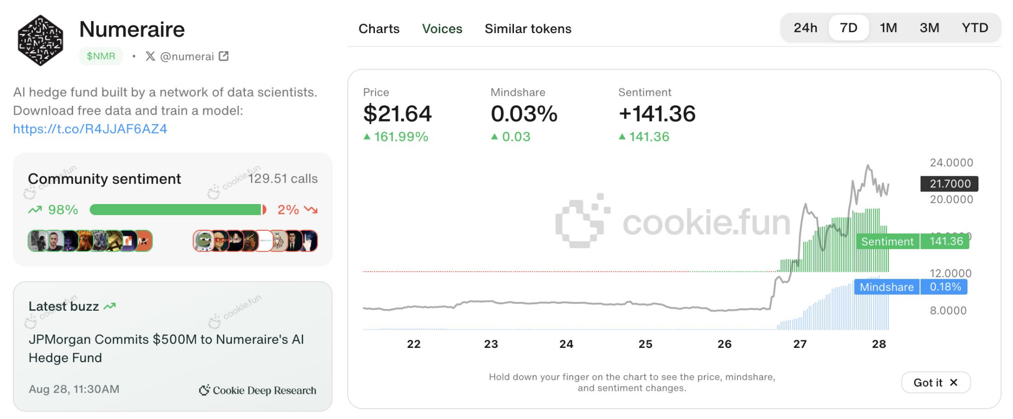На той же неделе Numeraire объявила, что JPMorgan, один из крупнейших в мире инвесторов в количественные стратегии, выделил $500 млн на инвестиции в фонды. Это объявление, вероятно, оживило рынок. Данные Cookie.fun показали, что интерес и настроения вокруг NMR резко возросли.