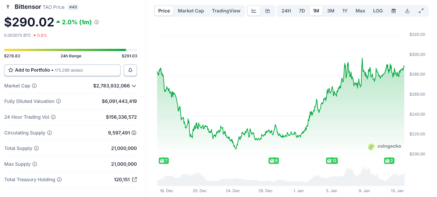 Динамика цены Bittensor (TAO) за последний месяц. Источник: CoinGecko