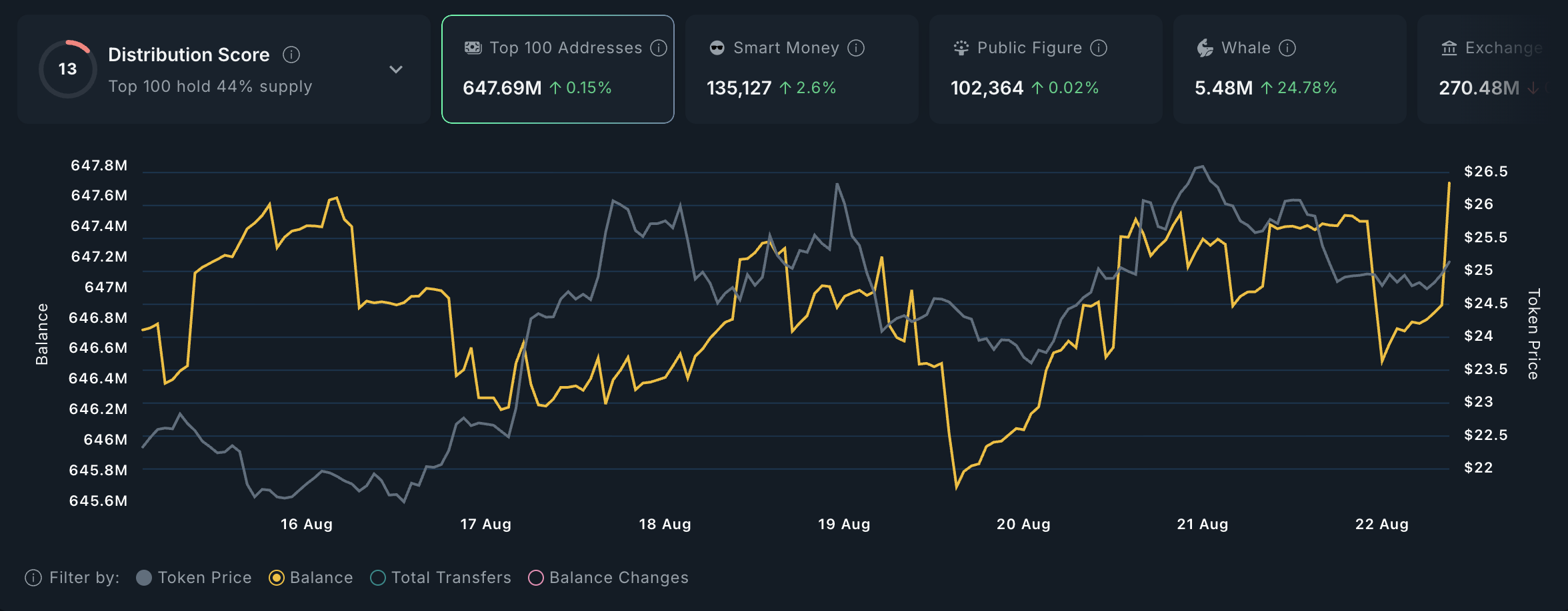 LINK, токен сети оракулов Chainlink, привлек внимание криптокитов на этой неделе. Ончейн-данные от Nansen показывают, что крупные кошельки увеличили свои запасы на 25%, владея более чем на $1 млн в LINK.