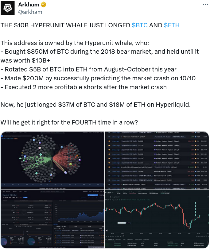 Помеченный аналитиками Arkham как HyperUnit криптокит, который получил известность после заработка свыше $192 млн на дампе в октябре, открыл длинные позиции на Hyperliquid в биткоине (BTC) и Ethereum (ETH) на $37 млн и $18 млн соответственно.