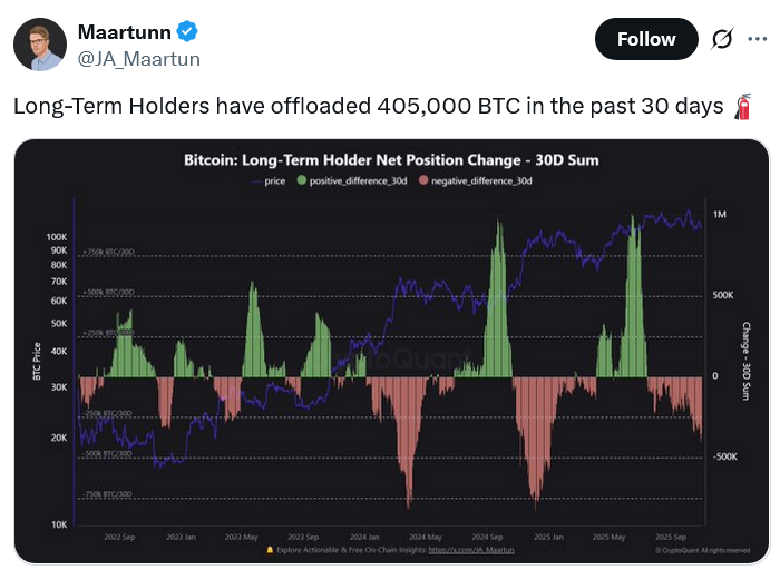По расчетам CryptoQuant, со 2 октября по 2 ноября долгосрочные инвесторы сократили позицию на 405 000 BTC