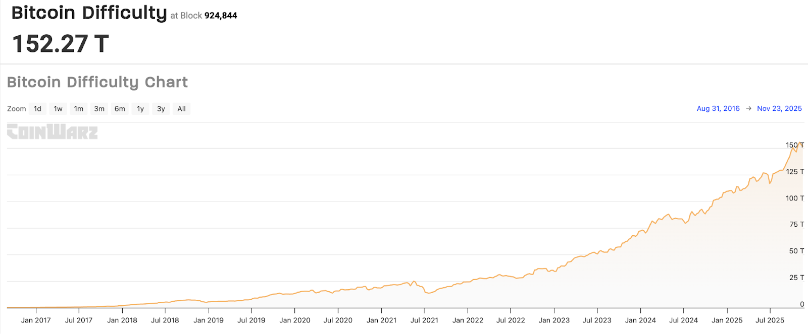гонка вооружений и усиление конкуренции в сети спровоцировали резкий рост сложности. К октябрю 2025 года показатель достиг 155,97 T, сделав майнинг несоизмеримо более энерго- и капиталоемким процессом по сравнению с первыми годами работы блокчейна;