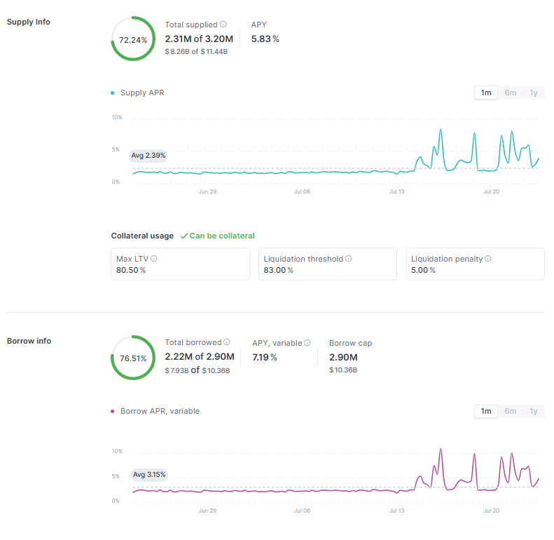 В некоторые дни APY по позициям в wETH превышал 10%. В данном случае поставщики ликвидности оказались в выигрыше, но занимающие активы пользователи — наоборот.