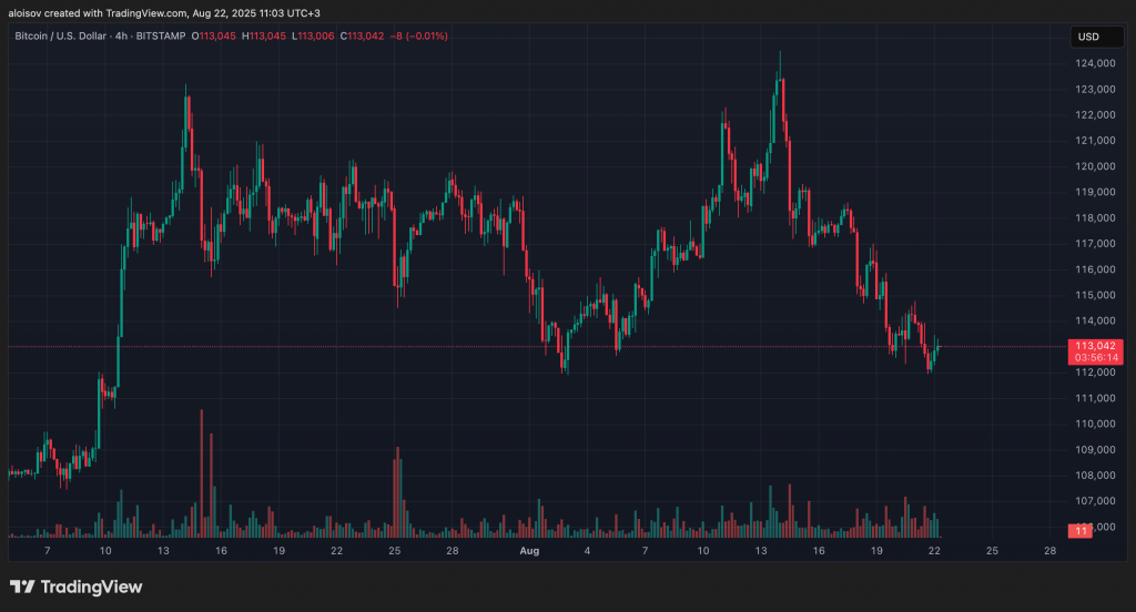 Биткоин продемонстрировал волатильность 21 августа, когда цена упала до $111 972 на бирже Bitstamp ниже психологически важного уровня $112 000. На момент написания статьи котировки восстановились до $113 042, эксперты активно обсуждают дальнейшие перспективы движения.